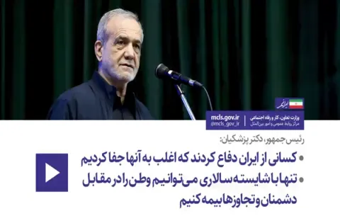 دکتر مسعود پزشکیان صبح امروز سه شنبه در آیین تجلیل از تلاشهای کارکنان وزارت تعاون، کار و رفاه اجتماعی در دوران جنگ تحمیلی رژیم صهیونیستی، ضمن گرامیداشت یاد همه شهیدان این جنایت، با بیان اینکه حتی کسانی که مورد جفا قرار گرفته بودند و با آنان برخوردهای مناسبی صورت نگرفته بود، كسانی که در زندان بودند یا کسانی که با نارضایتی کشور را ترک کرده بودند نیز به دفاع از کشور برخاستند، تصریح کرد: