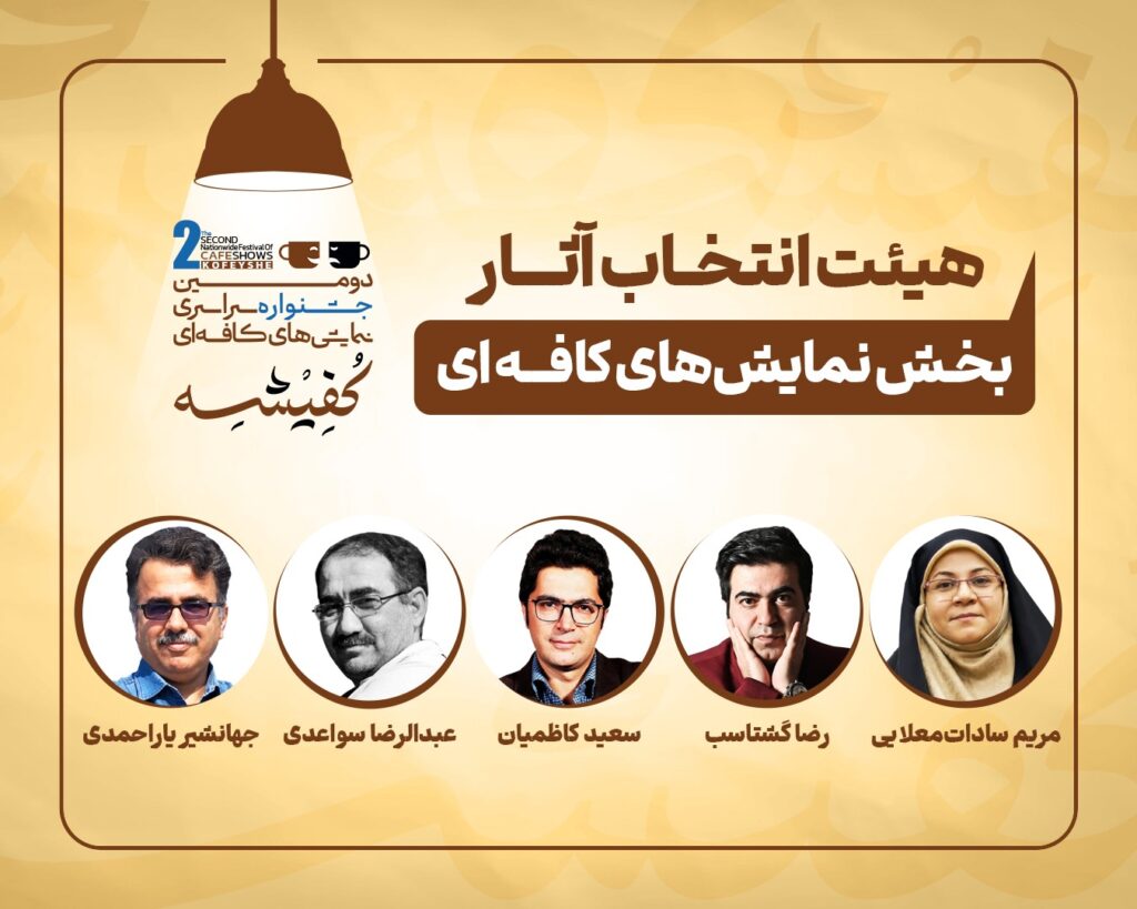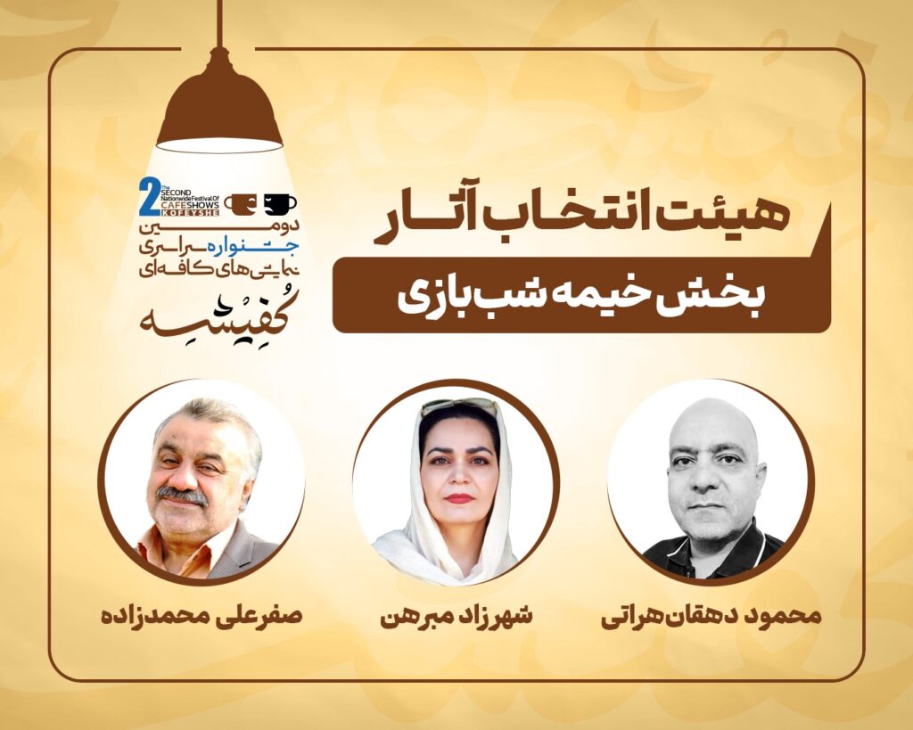 با صدور احکام دبیر دومین جشنواره سراسری نمایش‌های کافه‌ای «کفیشه»، اعضای هیأت انتخاب در سه بخش «کافه‌ای»، «نقالی و پرده‌خوانی» و «خیمه‌شب‌بازی و عروسک‌های سایه سنتی» معرفی شدند.