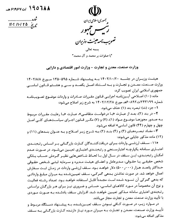 گفتنی است؛ آخرین نسخه از اصلاحیه قبلی ماده ۱۰ آیین نامه اجرایی قانون مقررات صادرات و واردات به تاریخ ۲۵ دی ماه ۱۴۰۲ به شرح ذیل است: