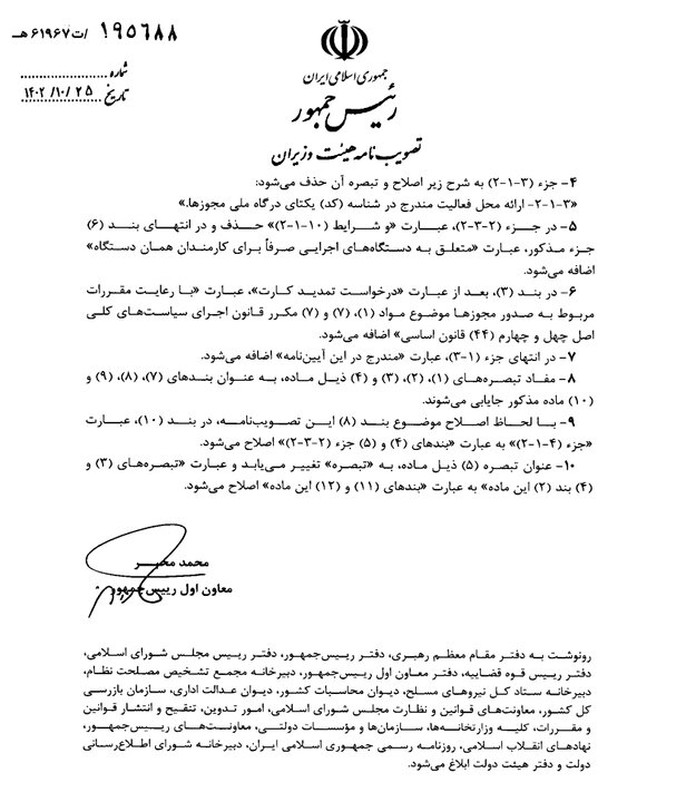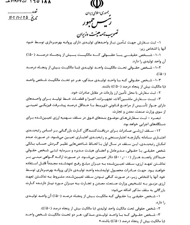 این تصویبنامه در تاریخ دوم دیماه سال جاری به تصویب رسیده و به امضای معاون اول رئیسجمهوری رسیده است. بر اساس این مصوبه، موضوع به وزارت صنعت، معدن و تجارت، وزارت امور اقتصادی و دارایی و بانک مرکزی جمهوری اسلامی ایران ابلاغ شده است.
